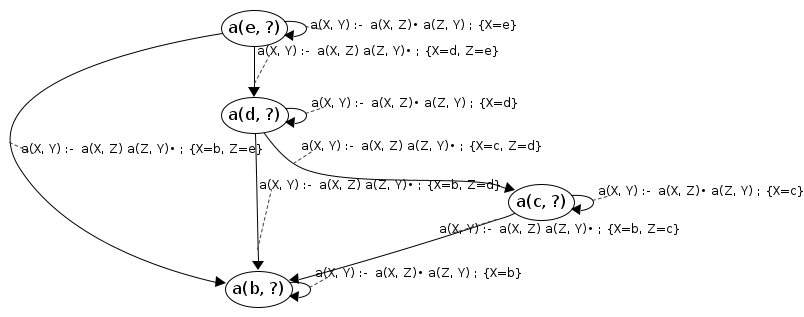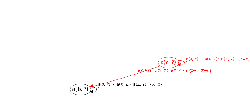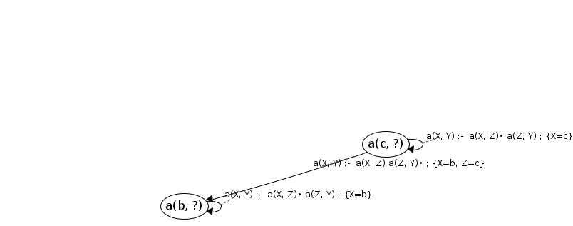 Processing a(c, ?) codePos a(X, Y)→•a(X|c,Z), a(Z,Y)