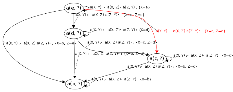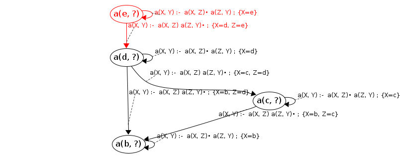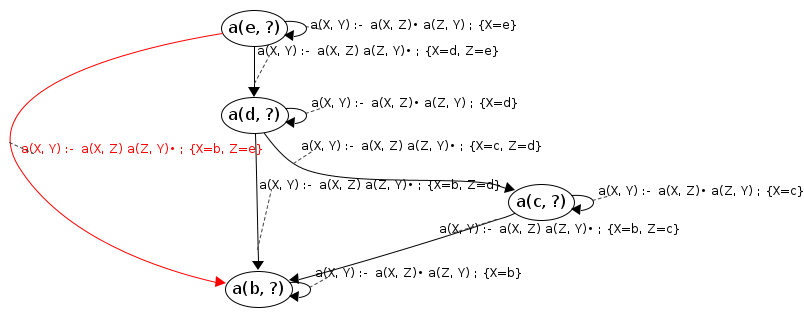 Processing a(e, ?) codePos a(X, Y)→•a(X|e,Z), a(Z,Y)