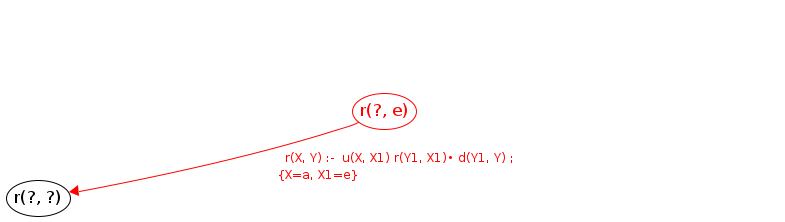 newVars: {X=a, X1=e} Processing r(?, ?) codePos r(X, Y)→u(X|a,X1|e)•r(Y1,X1|e), d(Y1,Y)