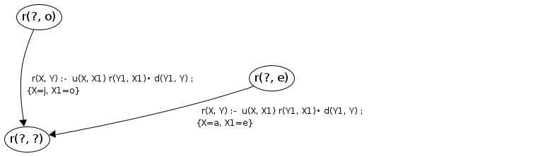 newVars: {X=j, X1=o} Processing r(?, e) codePos r(X, Y)→u(X|j,X1|o)•r(Y1,X1|o), d(Y1,Y|e)