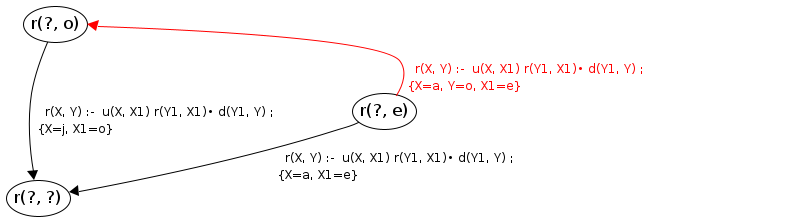 #1: JoinS: u(?, ?) → [a, e] will resume cont: r(X, Y)→u(X,X1)•r(Y1,X1), d(Y1,Y)