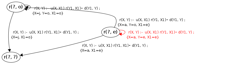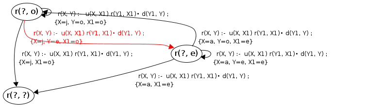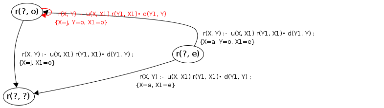 newVars: {X=j, X1=o} Processing r(?, ?) codePos r(X, Y)→u(X|j,X1|o)•r(Y1,X1|o), d(Y1,Y)
