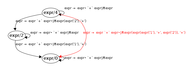 expr/4 → expr/0 ; expr → expr `+` expr• ; expr(expr(expr('1'), '+', expr('2')), '+')