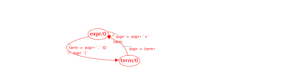 expr/0 → term/0 ; term → expr• `.` ID `(` expr `)` ; term