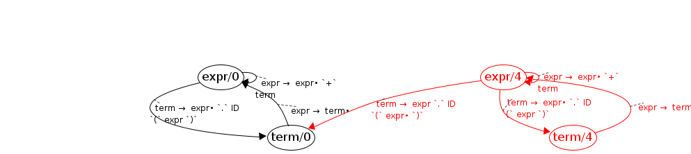 expr/4 → term/0 ; term → expr `.` ID `(` expr• `)` ; term(expr(term('x')), '.', 'apply', '(')